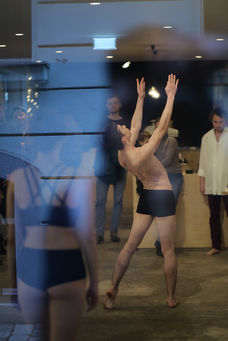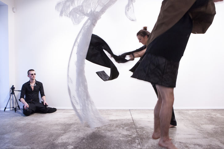 Andrej Petrovič and MarošBaran cooperated on the research topic of the influence of costume on movement material and vice versa - to study the impact of movement material on the costume itself. The research works with the concept of limitations and the physical limits of the dancer's body that the clothing / costume causes or removes.